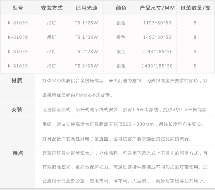 库安照明 办公照明 超市展厅吊灯 T5银色吊线灯铝材灯K-81003B