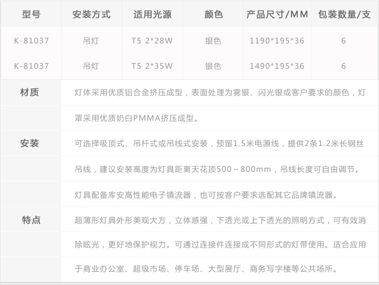 库安照明 现代商业照明 办公写字楼灯具 T5铝材灯吊线灯K-81037