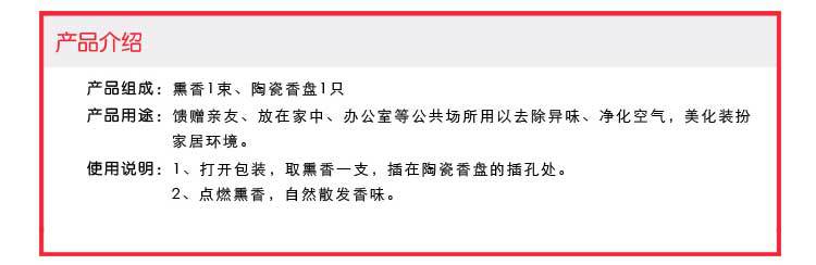 产品组成:熏香1束、陶瓷香盘1只 产品规格:6.5(直径)*28㎝ 产品克重:340.3g 产品用途:馈赠亲友、放在家中、办公室等公共场所用以去除异味、净化空气,美化装扮家居环境。 适用范围:挂在卧室、衣橱、包包、车内皆可,既是一件美观的装饰品,还可以自然散发香气,美化装饰家居环境。 产品用途:配合香薰精油使用,适用于家居、办公室、咖啡厅等场所,自然散发清新香气,净化室内空气。 |