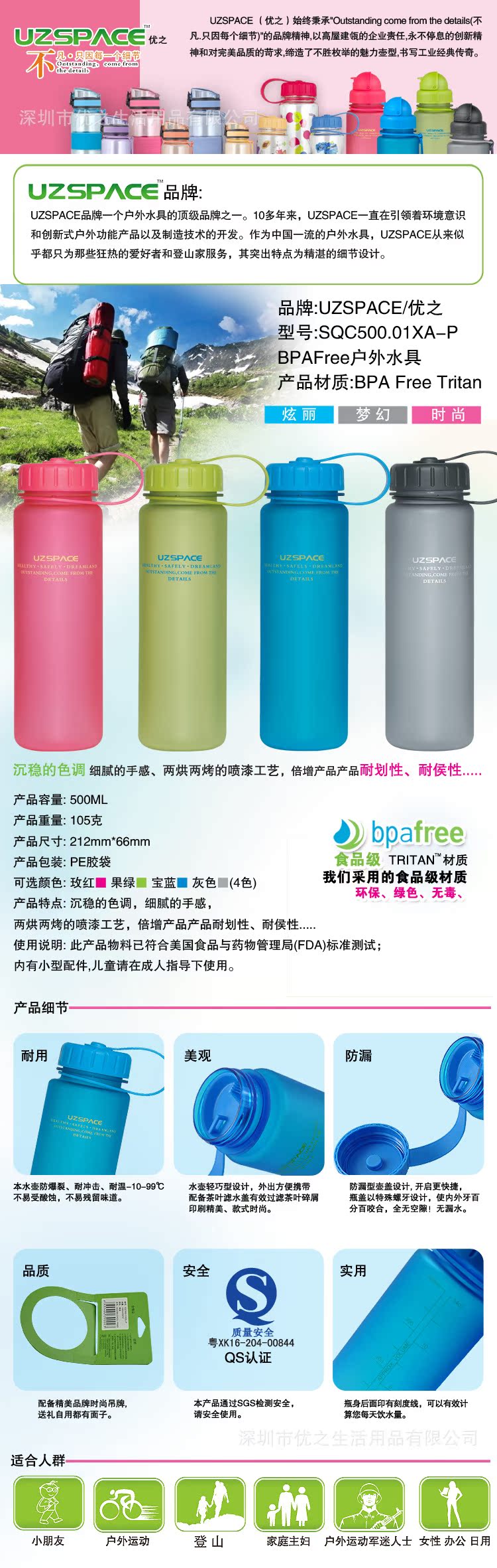 UZSPACE优之:UZSPACE品牌是一个户外水具的顶级品牌之一。10多年来,UZSPACE一直在引领着环境意识型和创新式户外功能产品以及制造技术的开发。作为中国一流的户外水具生产商,UZSPACE从来似乎都只为那些狂热的爱好者和登山家服务,其突出特点为精湛的细节设计。