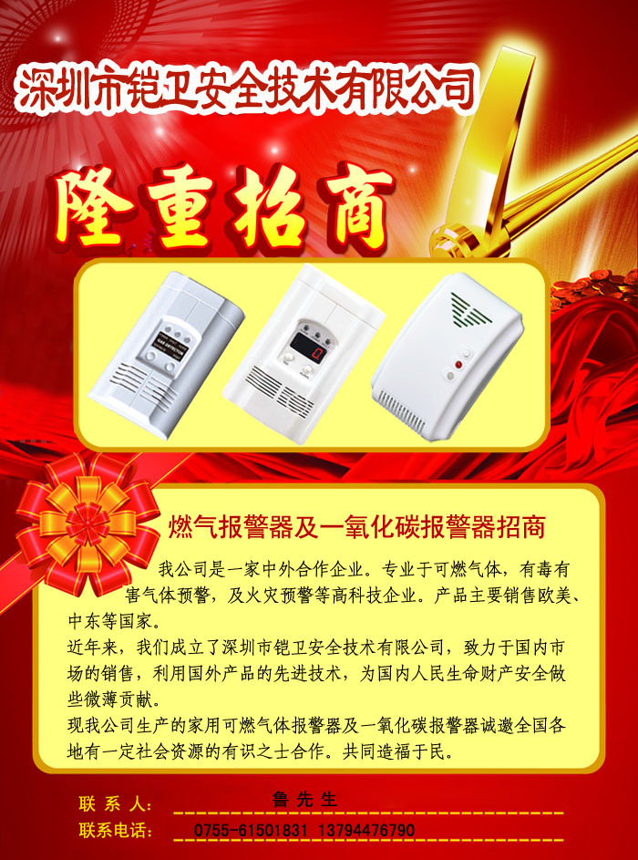 现我公司生产的家用可燃气体报警器及一氧化碳报警器诚邀全国各地有一定社会资源的有识之士合作。共同造福于民。