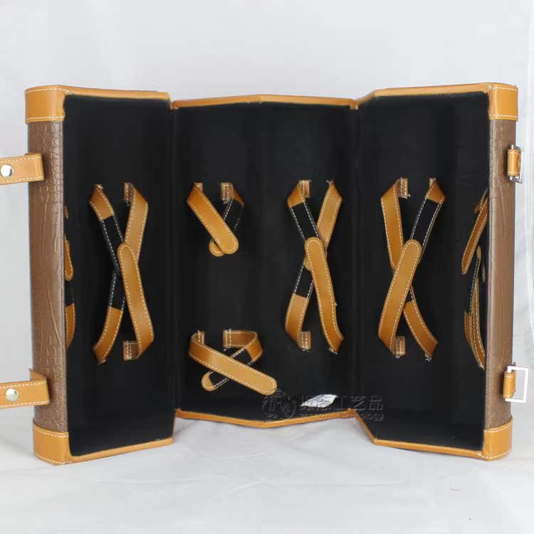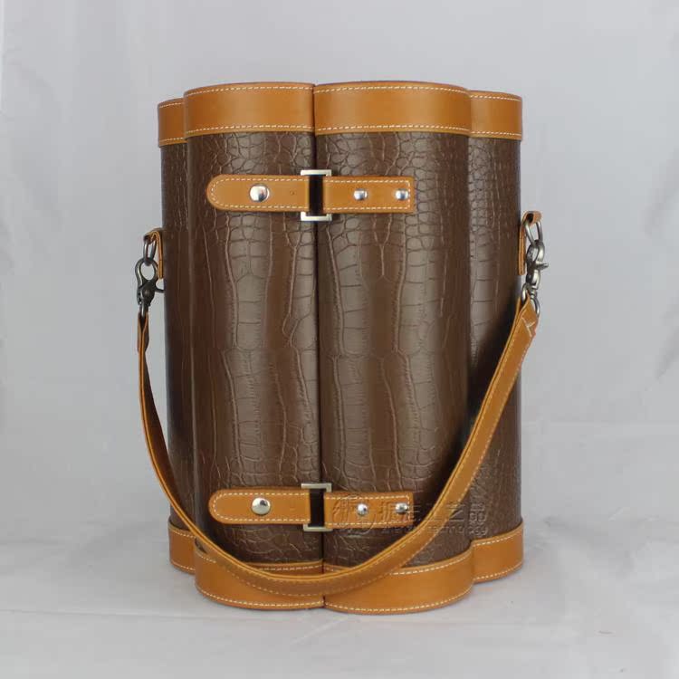 盒子款式:高档PU皮料,皮提手,白色车线。适用范围:标准750ML红酒瓶盒子内里:高档黑色绒布盒子净重:约3KG