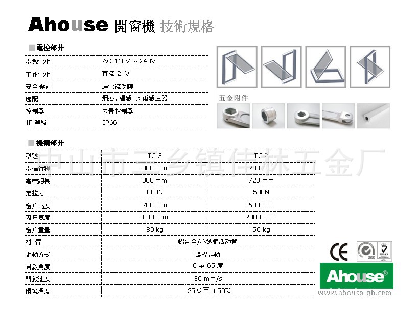 DC24V开窗机(TC),吊力至1000N,提供各种行程供选择.铝合金配件美观大方.适用于窗及其它多项应用.