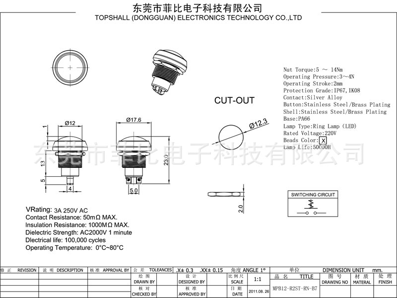 本开关属于中高端产品,采用优质的进口原金属材料经高速CNC和相关生产部门对质量的严格管控加制而成。具有IP65防水,防尘,防爆和高抗破坏之功能,产品的外型及表面美观,按键的手感很好,功能完善。其按键,灯,端子的详细分类描述如下列各项: