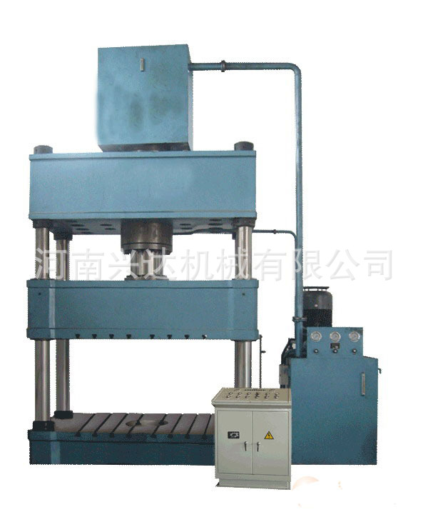 该液压机采用四柱式结构,经计算机优化设计,简单、经济、适用。液压控制系统采用插装阀集成系统,动作可靠,使用寿命长,液压冲击小,减小了连结管路与泄漏点。独立的电气控制系统,工作可靠,动作直观,维修方便。采用按钮集中控制,设调整(点动),单次(半自动)二种操作方式。可实现定程,定压二种成型工艺,并具有保压延时等性能。工作压力、行程根据工艺需要在规定的范围内可调。