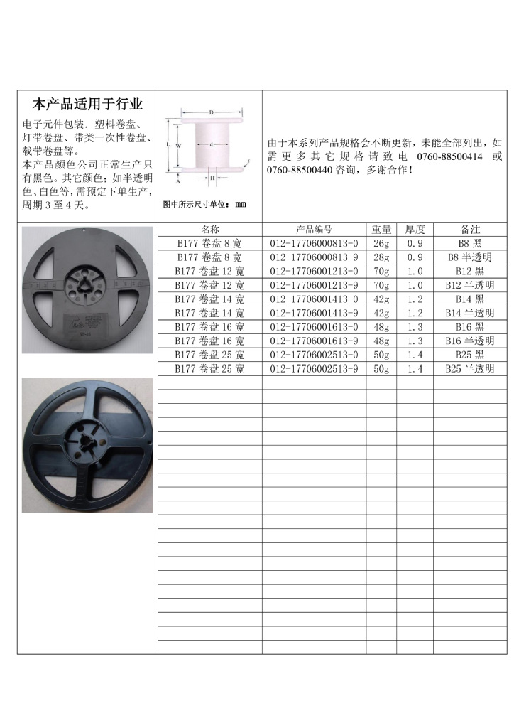 中山市众成包装制品有限公司专业生产主营产品有:载带卷盘、端子卷盘、SMD卷盘、塑料圆盘、电子包装盘、丝带包装、线类包装、软管类包装、灯带包装,铝箔袋、一次性包装纸盘等,提供多种型号的【塑胶卷盘一次性包装纸盘】,厂家直接供货价格优势明显,本厂提供的【塑料胶盘一次性包装纸盘】,质量100%过硬,【塑料胶盘】经久耐用,【塑胶盘】可以循环使用。*外径:7寸(178mm),13寸(330mm);*标准宽度:8mm,12mm,16mm,24mm,32mm,44mm,,56mm .材质及性能:PS材质,分普通、防静电、导电类型;3.颜色:白色、蓝色、黑色等(可根据客户要求配色);适用范围广泛.材质好,塑料面板,不变型做工精良,完全可以满足国内中高端客户的需求,适用于各种线路板、电子产品、精密机械配件、消费品、工业制品等包装。例如:pc板、ic集成电路、电子元器件、精密五金、汽配等,深受各界客商的一致好评和认可。公司拥有先进的生产设备,完整科学的质量管理体系,可为您提供优质的产品和服务。竭诚欢迎广大新老客户前来洽谈业务。