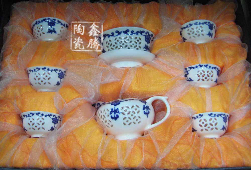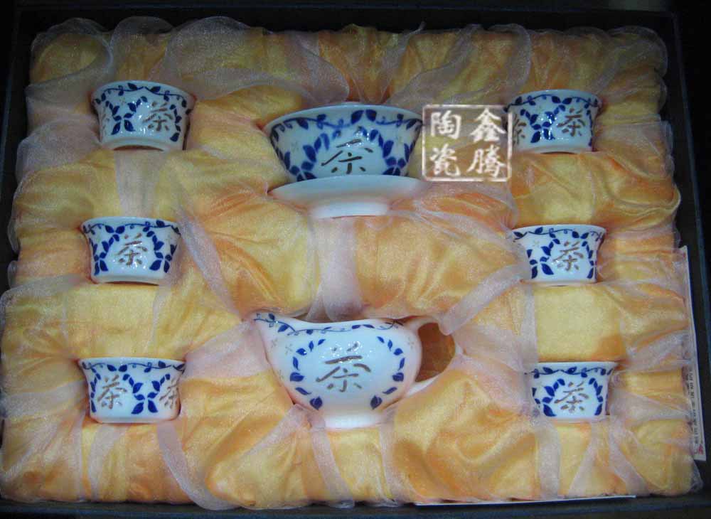 QQ:1637698949手机:18979804799(周献龙)网址: 景德镇鑫腾陶瓷经营部生产供应陶瓷茶具,高档手绘陶瓷茶具,功夫茶具,礼品茶具,时尚家居用品茶具,陶瓷日用品茶具,家居礼品陶瓷茶具,骨瓷茶具,定做礼品茶具饮茶离不开陶瓷茶具,茶具是指泡饮茶叶的专门器具,包括壶,碗,杯,盘,托等,古人讲究饮茶之道的另一个重要表现,是非常注重陶瓷茶具的本身的艺术,一套精致的茶具配合色,香,味三绝的名茶,可谓相得益彰。随着饮茶之风的兴盛以及各个时代饮茶风俗的演变,茶具的品种越来越多。我公司生产的景德镇陶瓷茶具造型优美、品种繁多、装饰丰富、风格独特。瓷质"白如玉、明如镜、薄如纸、声如磬"。有手绘青花、粉彩、玲珑、颜色釉各种样式。还可以根据您的需要印制您需要的各种图片、添加公司LOGO图形和文字等。 鑫腾陶瓷:作为一家植根与千年瓷都景德镇的陶瓷企业,我公司生产加工的礼品工艺陶瓷产品全部为高级工艺美术师精心设计,经过1300度以上高温烧制而成的精美陶瓷艺术礼品,永不褪色变色。是温馨相送、友谊联络、喜庆贺礼、工商馈赠、师生情谊、敬意表达、励志名言及节日纪念等传达非凡感受的最佳礼物。选择鑫腾,品质的保证;欢迎各界有识之士光临我公司参观指导!(出厂价供货,价格最优!)同时我公司还提供各类陶瓷工艺品、陶瓷纪念品、陶瓷礼品的设计加工和来样定做。