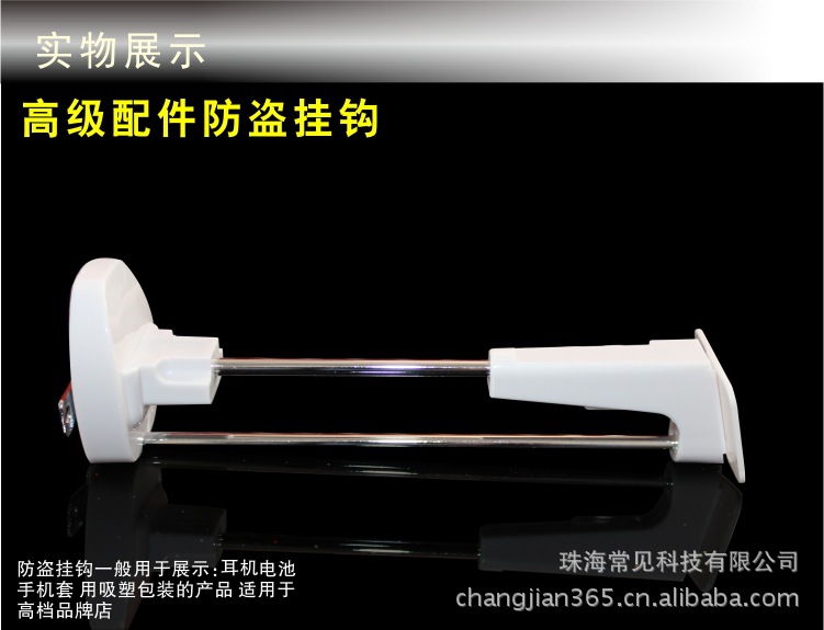 防盗挂钩是专门用于展览一些贵重物品和不适合被顾客反复打开包装接触的商品。主要适用于数码产品以及使用挂式吸塑包装的物品,例如数码配件、鼠标、充电器、蓝牙、电池、墨盒、内存卡等等。广泛用于商场,手机店,数码连锁店等等(例如苏宁、国美、中国移动、联通、中域电讯、恒通、易天......)。