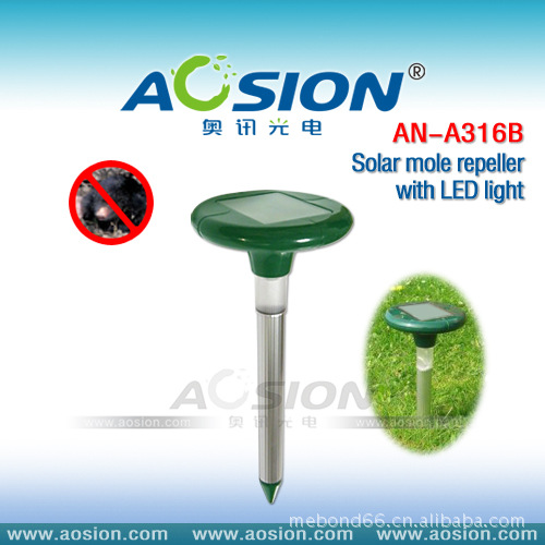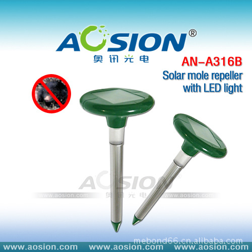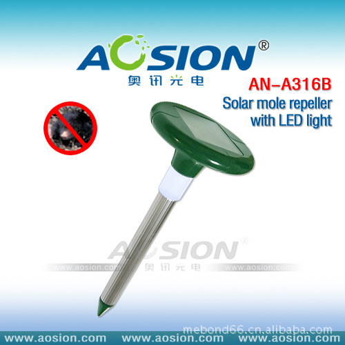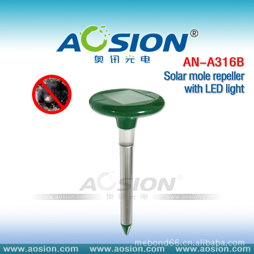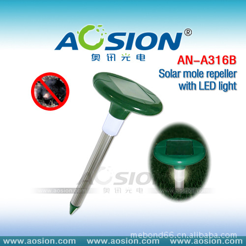 太阳能带灯驱鼠器(专利产品:ZL 2009 3 0168653.0) 太阳能板功率:4V/45MA 太阳能板尺寸:70×90MM 充电电池:1×1.2V/800mAH "AA" Ni-Cd 或者Ni-MH 充电电流:环境光度90000LUX的充电电流≥45MA 材 料: ABS & 铝管 产品总高度: 384mm 铝管直径: ∮28.78 安装方式: 地面安装 产品优点: 1.利用模拟刺激老鼠中枢神经的声波及振动波在地下发射传播,引起老鼠的不适感及恐慌不安,使其不愿接近现场。 2.适用于户外花园、苗圃、草坪等地面及地下驱鼠。 3.动力源为太阳能,省电免维护,为绿色环保产品。在太阳下暴晒一天可供4个阴雨天工作 4.特有加UV料,防紫外线,使用1-2年不会褪色 5.适用范围:625平方米 6.LED灯有自动识别系统,当感应到光线很弱的时候会自动开启,持续工作4个小时,点亮您的花园的同时也可以达到驱鼠的功效。 包装资料: Box size: 31.5x15.5x9.5CM QTY: 10 PCS N.W: 5 KGS G.W: 6 KGS MEAS:49x32.5x32.5CM 包装︰ 彩盒 认证︰ CE&ROHS