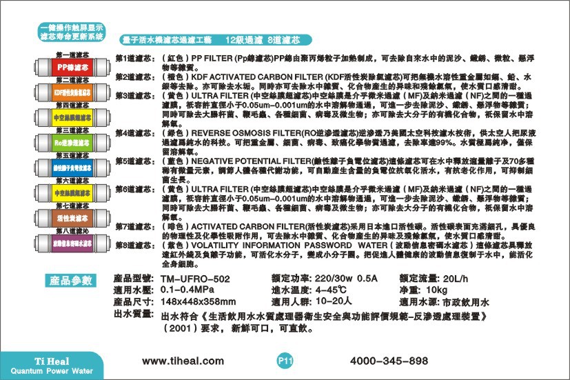 产品简介 感谢您购买了量子双水活水机,为使您能对该产品进行规范安装、正确使用、 合理保养,青年宫您仔细阅读产品说明书。 第1道滤芯:(红色)PP FILTER (PP绵滤芯)PP绵由聚丙烯粒子加热制成,可去除自来水中的泥沙、铁锈、 微粒、悬浮物等杂质。 第2道滤芯:(橙色)KDF ACTIVATED CARBON FILTER (KDF活性炭除氯滤芯)可把无机水溶性重金属如 镉、铅、水银等去除。亦可除去水垢。同时亦可去除水中杂质、化合物产生的异味和残余氯气, 使水质口感清甜。 第3道滤芯:(黄色)ULTRA FILTER (中空丝膜超滤芯)中空丝膜是介乎微米过滤(MF)及纳米过滤(NF)之 间的一种过滤膜,只容许直径小于0.05UM-0.001UM的水中溶解物通过,可进一步去除泥沙、 铁锈、悬浮物等杂质;同时可除去大肠杆菌、鞭毛虫、各种细菌、病毒及微生物;亦可除去大 分子的有机化合物,只保留水中溶解氧。 第4道滤芯:(绿色)REVERSE OSMOSIS FILTER(RO逆渗透滤芯)逆渗透乃美国太空科技滤水技术,供太 空人把尿液过滤为纯水的科技。可把重金属、细菌、病毒、致癌化学物质过滤,去除率达99%。 水质极为纯净,仅保留溶解氧。 第5道滤芯:(蓝色)NEGATIVE POTENTIAL FILTER(硷性离子负电位滤芯)这条滤芯可在水中释放适量离 子及70多种稀有微量元素,调节人体各种代谢功能,可自动产生含量的负电位抗氧化活水,有 抗老化作用,可抑制细菌生长。 第6道滤芯:(黄色)ULTRA FILTER (中空丝膜超滤芯)中空丝膜是介乎微米过滤(MF)及纳米过滤(NF)之 间的一种过滤膜,只容许直径小于0.05UM-0.001UM的水中溶解物通过,可进一步去除泥沙、 铁锈、悬浮物等杂质;同时可除去大肠杆菌、鞭毛虫、各种细菌、病毒及微生物;亦可除去大 分子的有机化合物,只保留水中溶解氧。 第7道滤芯:(啡色)ACTIVATED CARBON FILTER(活性炭滤芯)采用日本进口活性碳。活性碳表面充满细 孔,具优良的物理性及化学性吸附作用,可去除水中杂质、化合物产生的异味及残余氯气,使 水质口感清甜。 第8道滤芯:(紫色)VOLATILITY INFORMATION PASSWORD WATER(波动信息密码水滤芯)具释 放远红外线及负离子功能,可活化水分子,变成小分子团。把促进人体健康的波动信息复制于 水中,能活化全身细胞。 技术参数 产品型号:TM-UFRO-502 额定功率:220/30w 0.5A 额定流量:20L/h 适用水压:0.1-0.4MPa 进水温度:4-45℃ 净重:10kg 产品尺寸:148x448x358mm 适用人群:10-20人 适用水源: 市政饮用水 出水质量:出水符合《生活饮用水水质处理器卫生安全与功能评价规范-反渗透处理装置》 (2001)要求, 新鲜可口,可直饮。 安装使用及调试 用户购机后可约请我们的专业安装人员为您免费安装和调试,安装之前请确认包装箱 内随机附件的足够和完整的。 环境要求:进出水管、地漏、不易受雨淋。 安装及调试: 1、 暂时关闭水龙头开关; 2、 拆下自来水龙头; 6、 将随机配送的变压器分别与净水器的电源插排连接。 7、检查及冲洗卸下活水机的面盖,里面有电源线连 接,依据电脑板的操作指南经行冲洗。 9、 电脑板操作指南: 直接触摸电脑板的电源键,打开电脑板开始工作。没有通水时电脑板提示缺水,打开 进水阀,同时打开排污口、鹅颈龙头,电脑板提示冲洗,当鹅颈龙头出水后马上关上鹅颈 水龙头,排污口保持打开,冲洗15分钟或更长时间。15分钟以后打开鹅颈龙头,排水15分 钟或更长时间。 10、 关闭水龙头,待用。 11、 日常使用,长时间不用时关闭电脑板开关,使用前打开开关即可。每次打开都提 示冲 洗,按提示冲洗进行即可。每天早上第一次使用之前,应排放隔夜水1分钟,再打开水 龙头,排放500ML的水后,正常使用! 12、 电脑板操作明细说明 (1)电脑板具有滤芯管理的功能,滤芯使用寿命到的时候,会自动提示更换滤芯和 膜。 (2)滤芯的更换说明:滤芯的使用寿命与使用的时间和使用地的水质有密切的关系。当 出现出水水质变差,口感下降,出水流量明显变小(应排除由于水温下降导致水流变 慢的原因),必须立即更换滤芯,以保证本机的最佳水处理能力。一旦五个滤芯指示 灯中某个颜色全部灭掉,表示亮灯那级滤芯要更换。 滤芯更换后必须对存储器“清零”:先按“滤芯选择按键”,选中你要清零的哪个 滤芯,哪个滤芯对应的图标闪烁,按下“滤芯清零按键”,听到嘀的一声,并且这级滤 芯指示灯全亮。滤芯选择键:按功能键的时间少于3秒;滤芯清零键:按功能键的时间长 于3秒; 日常维修 为了充分发挥各滤芯的效用,同时保证活水水质达到标准,用户应定期更换 滤芯,以确保长期享用优质的饮用水,滤芯的寿命和更换的周期因水源的水质的 不同及用水量的多少而异。一般情况下,按照电脑板的提示更换滤芯。 注意事项 1、 进出水管请勿折弯、以免严重影响出水量; 2、 安装位置应结合现场环境和用户的要求,充分考虑使用和维护的方便; 3、 安装完毕后检查个接头及管路是否漏水; 4、 水压检测 安装前首先检测用户的自来水压力,如果压力低于0.05Mpa,建议安 装管道增压泵,并确保压力不超过0.35Mpa,如果压力超过0.35Mpa,请安装 减压阀,并调整减压阀微调,将其出口(即h活水机的进水压力)压力调整在0.2 -0.3Mpa; 5、 滤芯都是有额定使用寿命的,为确保各滤芯充分发挥作用,同时保证出水水质, 请用户定期更换滤芯。 6、 长期不使用活水机时请关闭进水阀门,再次使用时请对活水机经常充分的冲洗。