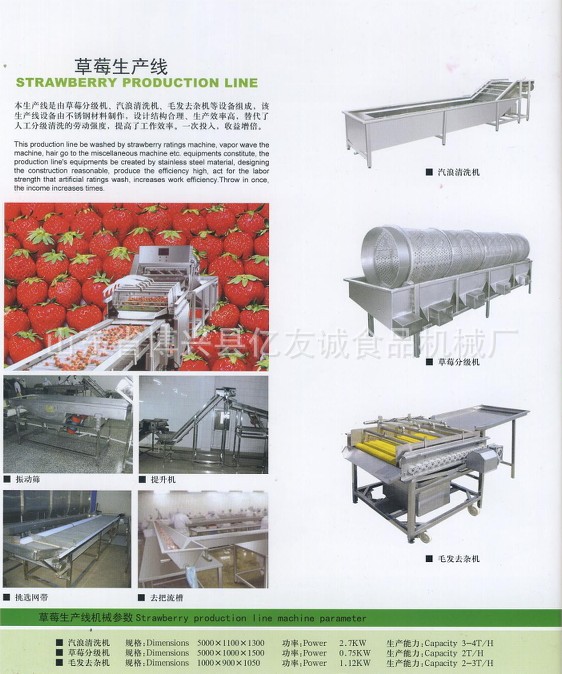 本生产线是由草莓分级机、汽浪清洗机、毛发去杂机等设备组成,该生产线设备由不锈钢材料制作,设计结构合理、生产效率高,替代了人工分级清洗的劳动强度,提高了工作效率。一次投入,收益增倍。