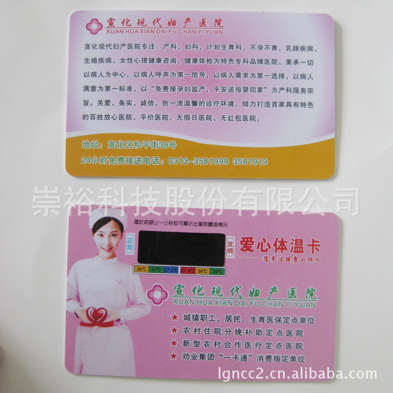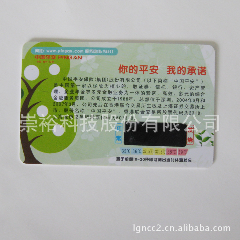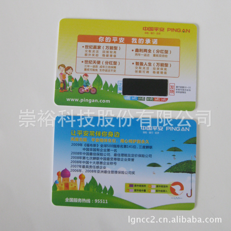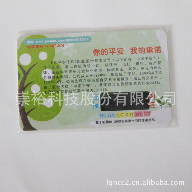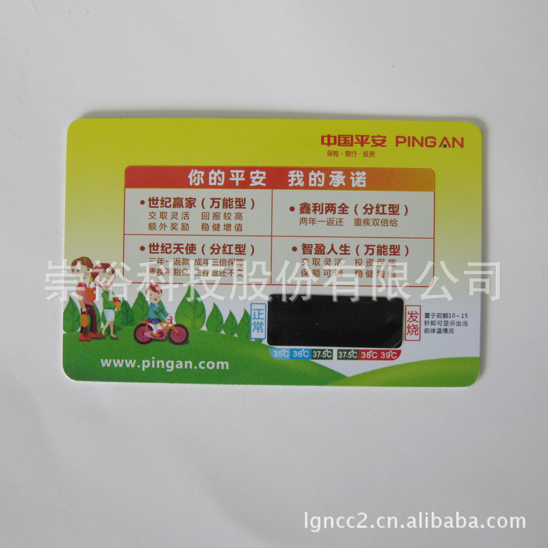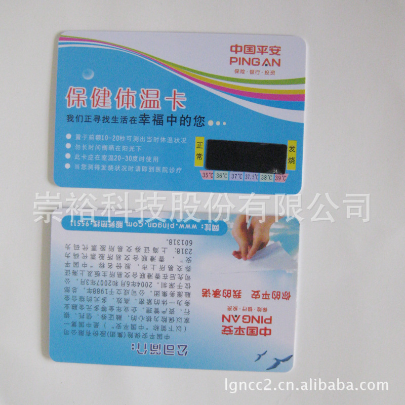 广告体温卡系列产品用PVC胶片或硬纸卡等材料,结合液晶感温贴片,可以通过不同的颜色显示温度。