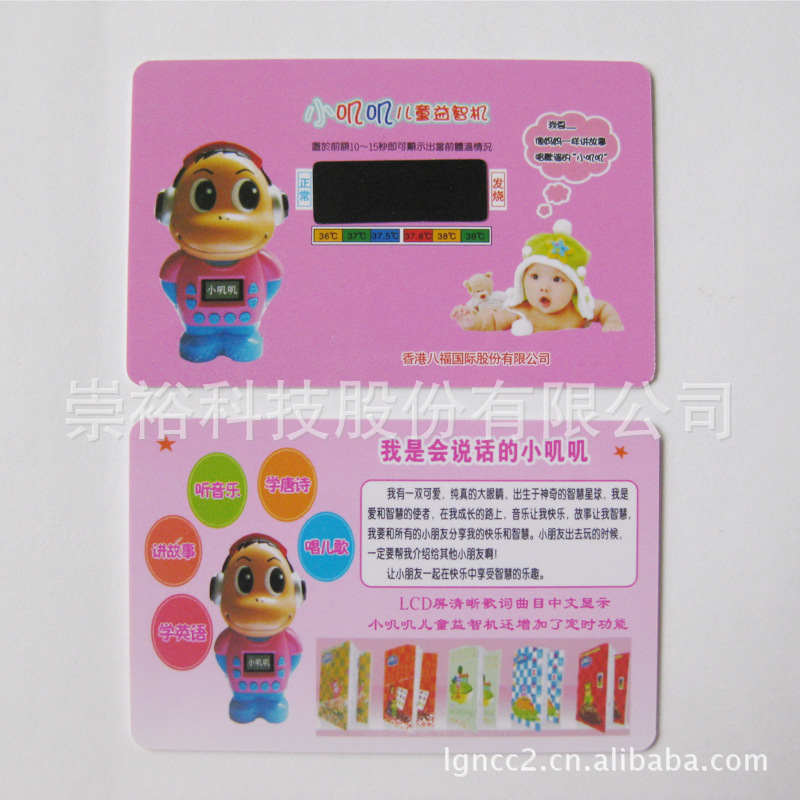 此产品是一种可以测试体温的广告礼品及赠品,在国外已广泛应用,但在国内使用很少。产品外观美观,有较强的实用功能和价值,也可以制作成具有纪念性的卡片或广告宣传礼品等。目前产品作为金融保险、交通、电信、医院、学校、超市商场、旅行社(公司)、旅游景点以及大、中型企业赠送客户的礼品,情况良好,效果明显。