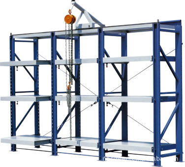 模具架主要用于存放各类模具物品,一般可分为标准型模具架和重型模具架。顶部可配置移动式葫芦小行车,以方便起吊模具。