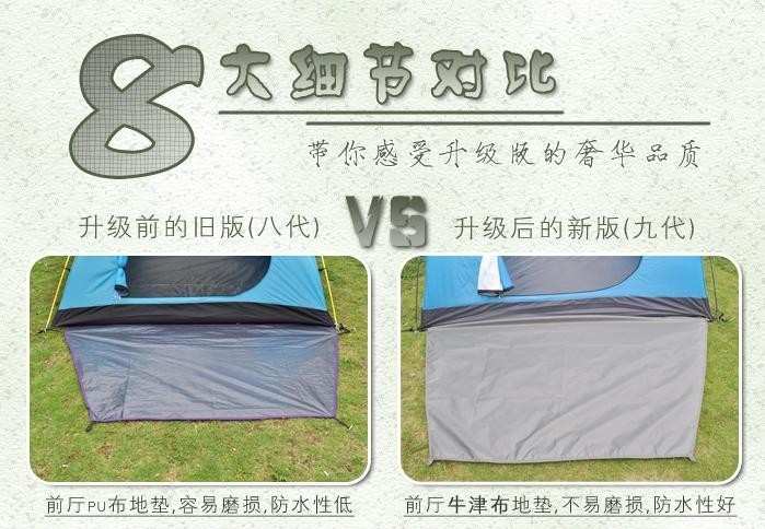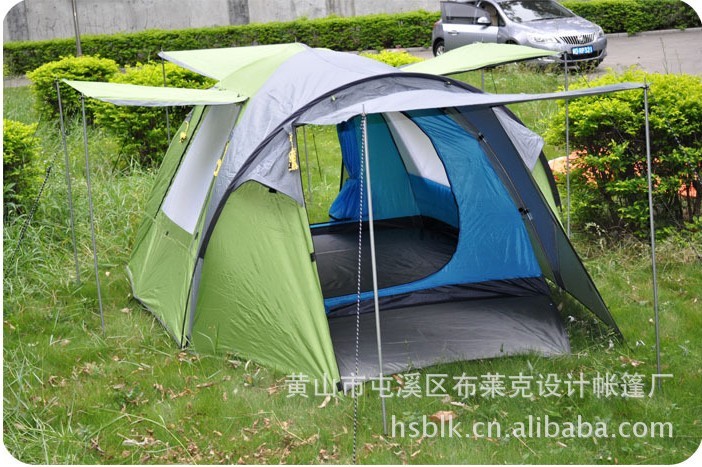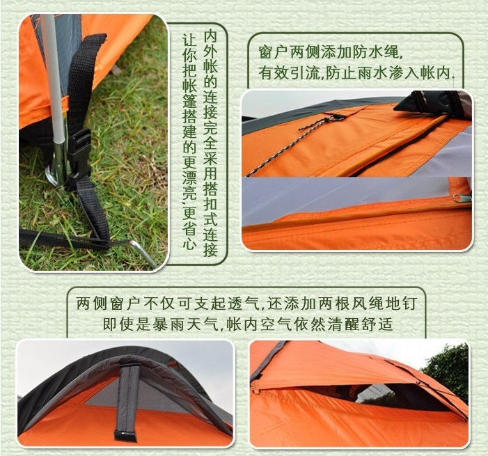 ※产品构造: 专业前卫高档双层3-4人帐篷 一房二厅设计 前后开门 左右大窗 门窗均可以同时支起遮阳 前门2侧设计透气孔 内帐更贴心设计帐灯挂钩及储物袋 内外帐插扣连接 简洁实用漂亮