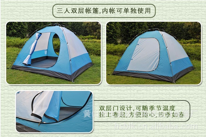 ※产品特点: 专业霸气团体家庭户外防暴雨双层3-4人帐篷!适应4季不同的气侯环境,内帐空间可达4平米多,可同时容纳可供3-4人躺下休息/6-7人围坐打牌.新款内帐加长加高加宽,身材高大的朋友在帐内无任何压抑感,空间十分开阔,增添户外生活愉悦舒适.且放入203*182*22CM都不会出现挤内帐.抗风,防寒,防雨性能非常好!前后门设计更透风,更明亮,进出方便.门窗均可支起遮阳,把门盖如图撑起来,厅就立刻变大`变高`变长,可在下面乘凉休闲,左右大窗,更增强通风性能.考虑到雨水天气和帐内热蒸气更贴心设计了透气孔,而且雨天还可以用风绳把窗户拉成透气孔,让你帐内毫无闷热感.结构稳固每个角都有地丁固定外加帐身6条风绳,双层门设计,内采用防蚊虫网,外层设防水防紫外线布料.外帐整件及帐底压PU防水胶条,大外帐包到底,更增强防雨`防风‘保暖性能.