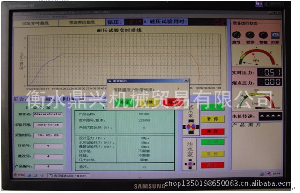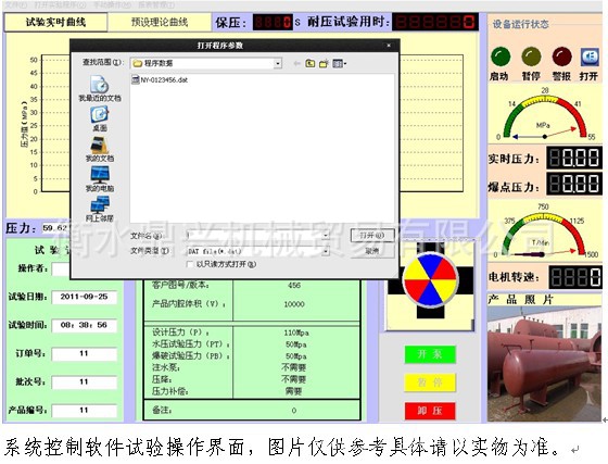 本系统内置本公司自主研发的专用控制软件,操作界面人性化,软件性能成熟稳定无缺陷,可以任意设定试验项目、压力值、保压时间等各种试验参数。完善的人机交互界面,制定试压方案后会通过弹出窗口的形式引导操作员完成实验。通过对话框上“确定”,“取消”按钮对相对危险(例如爆破实验)的试验项目,让程序员进行确认,确定实验的准确与安全。软件可根据用户技术要求更改功能,可按照用户自定界面及功能编制,以双方最终沟通需方认可的界面为准。