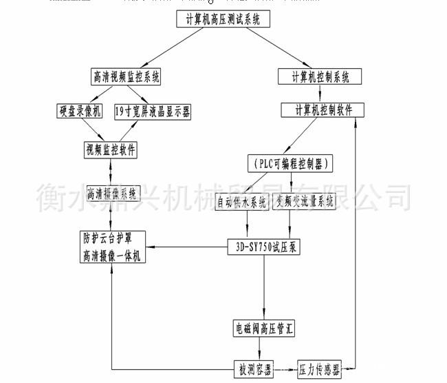 该计算机控制系统配套试压泵为3D-SY100Mpa,额定排出压力100Mpa。额定流量是227L/H,配套为普通电机功率5.5Kw。外型尺寸和重量无特殊要求。配套压力表、安全阀、压力传感器满足对应试压泵的要求。