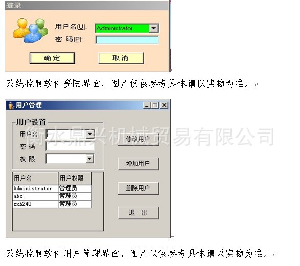 系统控制软件的使用者有各自的帐户和密码。此功能非WINDOWS的系统的登陆权限密码。在微机控制软件中可以设置使用者各自的用户名和密码。该密码机制有助于防止未经授权的操作员进入系统或进行与其权限不符合的操作和参数设置。软件使用者密码只有在系统授权的情况下由操作人员进行修改系统控制软件程序参数设置界面,图片仅供参考具体请以实物为准
