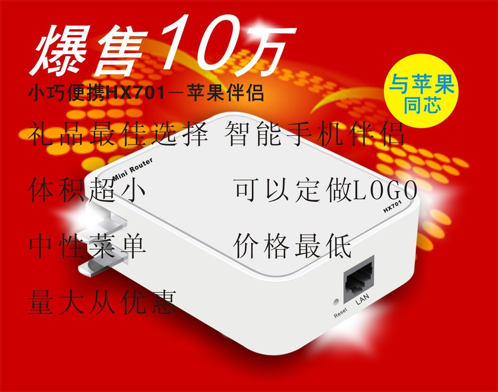 ? 内置220V电源插口,可插入任何电源插孔上,即插即用;? 支持1个USB接口,手机提供充电电源;;? 快速的上网模式设定、通过一个按键,完成DHCP、上网模式快速切换;? 通过无线网络访问U盘以及手机等存储设备,支持FTP上传下载文件到U盘;? 自研的HTML5 WEB存储系统,通过PC浏览器或者手机浏览器即可以访问U盘内容,完美的mini NAS功能;? WDS无线桥接功能,轻松扩展无线网络;? 提供DoS攻击防范,具有病毒自动隔离功能;? 支持虚拟服务器、特殊应用程序和DMZ主机等多种端口转发,可用于建设内网网站;? 内建防火墙,支持IP、MAC、URL过滤,可灵活地控制上网权限与上网时间