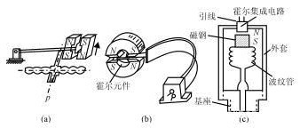 HAL131霍尔开关电路 TO-92UA u管脚定义 1 VCC电源电压 2 GND地 3 OUT集电极开路输出 高灵敏度单极性霍尔效应集成传感器 差分放大器、温度补偿单元、施密特触发器和集电极开路输出级组成的磁敏传感电路,其输入为磁感应强度,输出是一个数字电压信号。它是一种单磁极工作的磁敏电路,适合于矩形或者柱形磁体下工作。可以在-40℃ 125℃范围工作,其电源电压工作范围从3.8V 到30V 负载电流能力最高可达到45mA。封装形式为SIP3L(TO92S) SOT23 典型应用场合 直流无刷电机无触点开关 位置控制电流传感器 汽车点火器安全报警装置 隔离检测转速检测 产品技术参数 极限参数 电源电压VCC -30~+30 V 磁感应强度B 不限Gauss 输出反向击穿电压VCE -30 V 输出低电平电流IOL 45 mA 最大允许的功耗PD 450 mW 应用举例:压力传感器---霍尔压力传感器由弹性元件,磁系统和霍尔元件等部分组成,如图所示。在图中,(a)的弹性元件为膜盒金属加工网,(b)为弹簧片,(c)为波纹管。磁系统最好用能构成均匀梯度磁场的复合系统,如图6中的(a)、(b),也可采用单一磁体,如(c)。加上压力后,使磁系统和霍尔元件间产生相对位移,改变作用到霍尔元件上的磁场,从而改变它的输出电压VH。由事先校准的p~f(VH)曲线即可得到被测压力p的值。