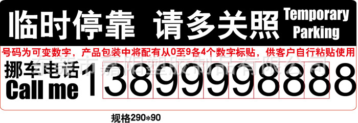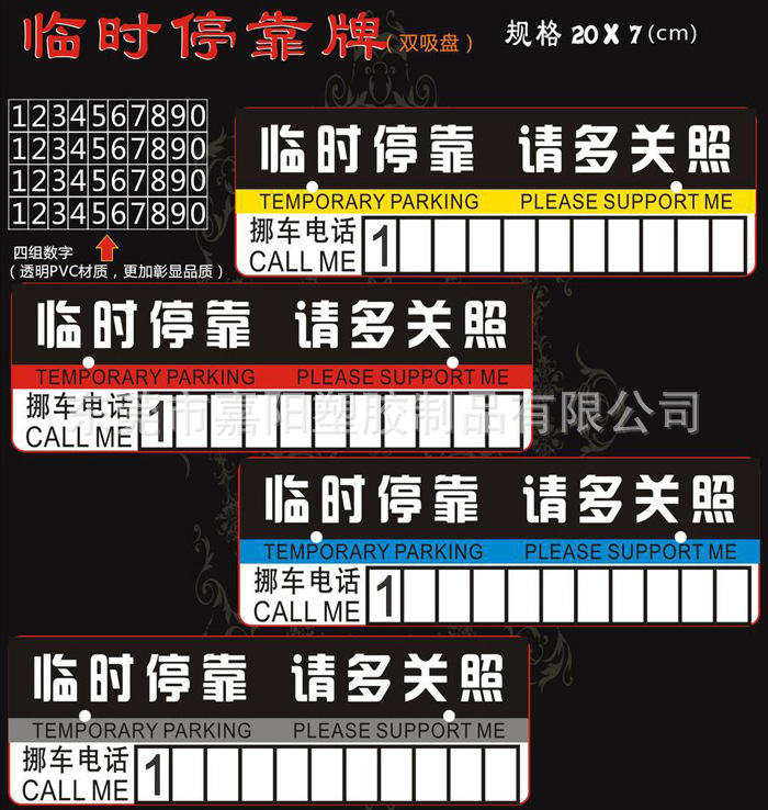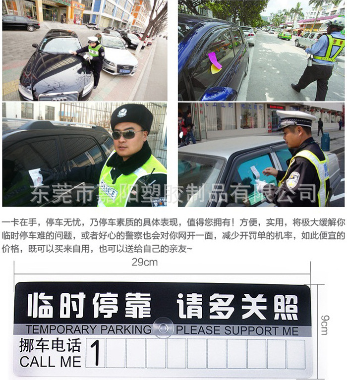 产品名称:停车卡停车牌材 质:环保pvc品 牌:JY(客户自定)包 装:单个产品OPP袋装(可根据客户要求订做)风 格:简约技 术:滴胶成型尺 寸:290*90mm 客户自订颜 色:蓝色、红色、黄色 (客户自定)用 途:汽车临时停靠联络号码司机朋友们常常会遇到这样的问题,开车在外找不到合适的停车位又忙着办急事,可能会临时占道或者堵着别人的出口或门口。这样也很容易引起别人的不便,有不少人会在挡风玻璃上,车窗上留下名片或者纸条再离开,但是遇到刮风下雨就没有用了,而且容易掉。为了迎合广大车友的需求,工厂特别设计了以环保pvc材质制作的“临时停车牌”,停车牌上面写着“临时停车,请多关照”,并附有车主的联系电话,非常人性化。停车牌还配有强力的吸盘,可以吸在前挡、侧挡、后档、玻璃上不会掉,每一个停车牌都配有四组数字,使用方便,可以反复拆卸。通过告示牌上提供的的电话号码不仅方便了自己,也不用担心影响别人,造成人为车体受损。停车牌采用通过环保认证的pvc软胶材质,无毒,无味,对人体没有任何伤害呢。产品具有很好的抗张强度(可达到500PSI)及抗撕性(可达88LBS)极佳的耐热、耐寒、抗氧化、抗腐蚀性。
