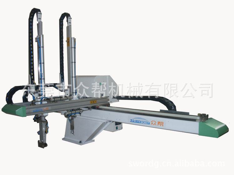 横行轴采用变频马达驱动,也可以选用Ac伺服马达驱动。上下及引拔轴使用气缸驱动。横行、上下手臂均使用进口的高刚性线性滑轨。引拔及上下使用质量轻高刚性的铝合金挤型梁配合线性轴承及高刚性轴承钢,能达到取出速度快、高效能、震动小、使用寿命长的要求。