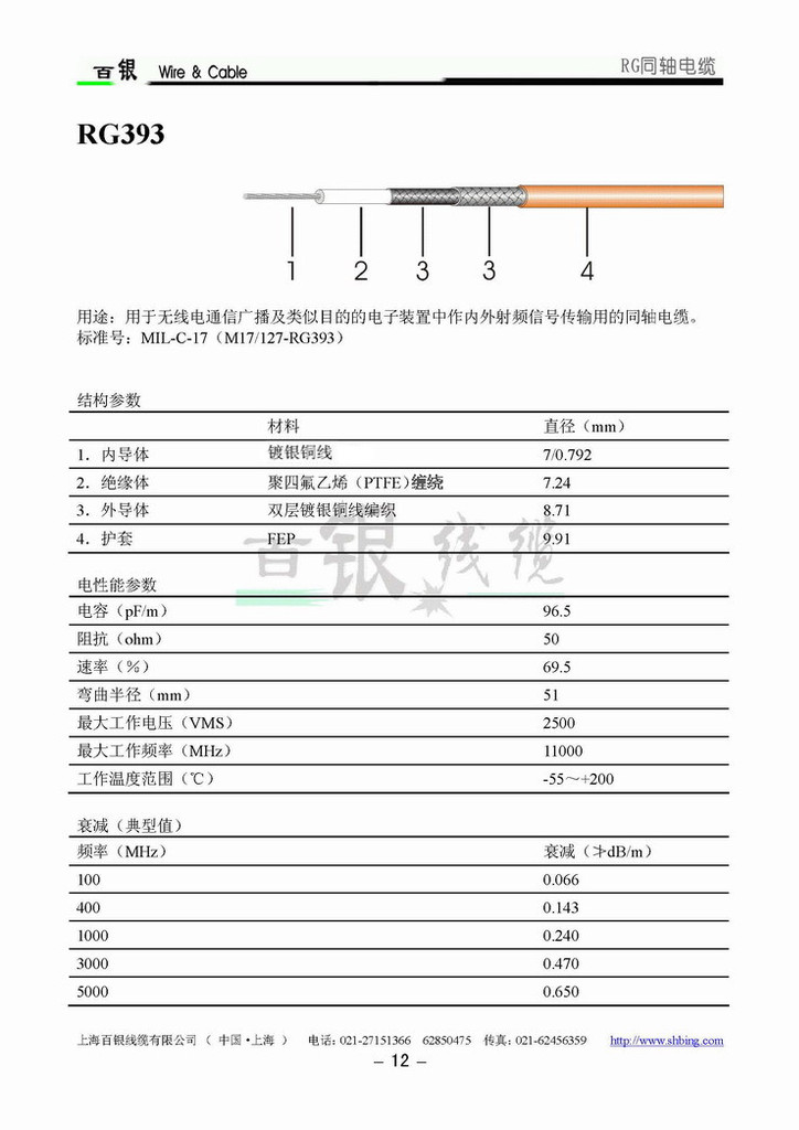 大功率RG393美军标射频同轴电缆,双层镀银编织屏蔽