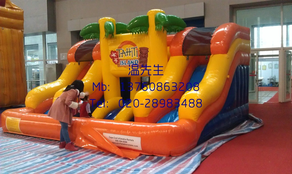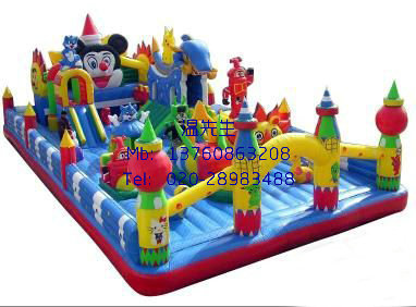 儿童充气弹跳城堡是当前非常流行、可玩性和安全性高、商业空间很大的一种娱乐设施和娱乐项目,它从儿童的生理和心理特性出发而研制,内含滑梯、蹦床、攀岩、迷宫、各式各样的形象卡通动物造型,有丰富的娱乐项目,犹如童话般深受孩子们的喜爱。它具有安全性、综合性、可观赏性、新颖性,色彩鲜明,经久耐用等特性,通过科学的立体组合,采用超强的防水布制作而成,这是一种综合性极强的娱乐乐园。游戏者通过翻、滚、爬、摇、晃、跳、钻等新奇的活动方式,达到开发智力,锻炼身体,愉悦身心的目的。本产品因其随意性和无动力装置受到买家的欢迎,安全可靠,管理简单,维修方便。 材料:本产品采用0.55mmPVC夹网布做成,材料具有无毒、阻燃、环保,1000股交织聚脂纤维双面PVC涂布,抗拉强度3478N,撕裂强度1572N、粘着力188N/5cm,抗寒-30度、抗热+60,提高了其使用寿命。