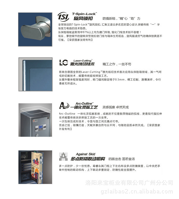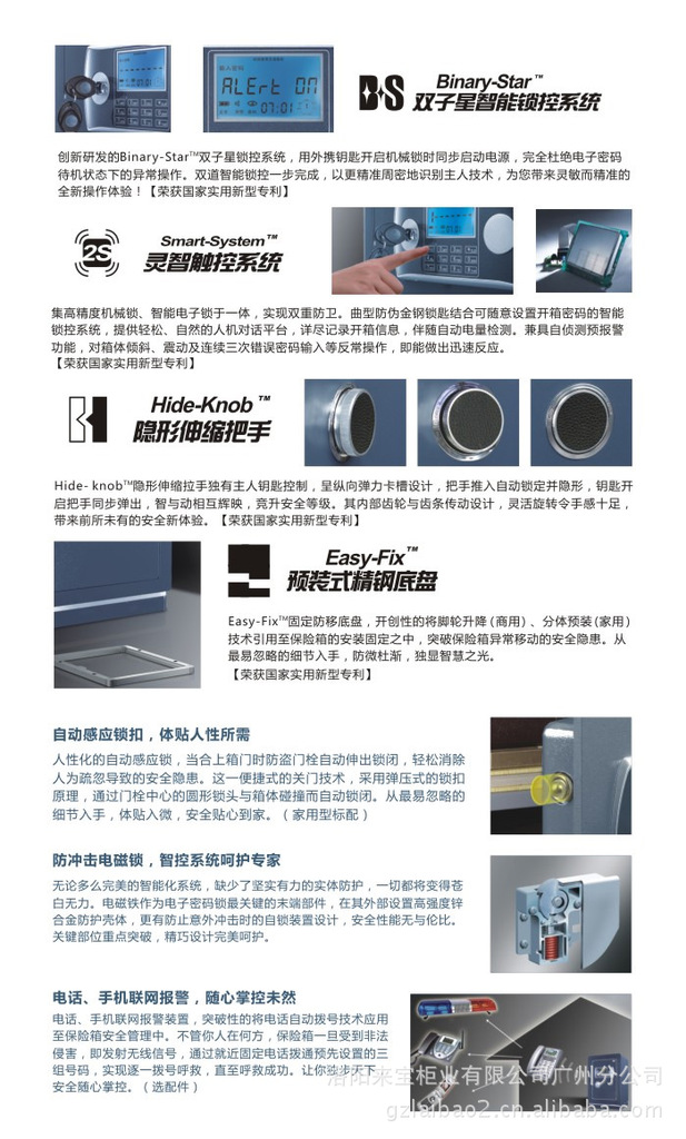 三、看防盗性能 保险箱的性能主要有防盗、防火、防磁、防水、防爆等,不同的要求应购买不同的保险箱,现在我国市场上主要是防盗保险箱,只能艾谱等少数品牌有防火保险箱,我们平时接触最多的也是防盗与防火保险箱,作为家用,主要考虑的还是防盗,既然选择防盗保险箱,那就要看保险箱的防盗性能。影响保险箱的防盗性能的有以下几个因素: 1、所用材质(主要是钢板)的硬度:材质越硬,越不易撬变形,不易被钻开; 2、门缝的间隙:间隙越小,窃贼所用的窃取工具将无从下手,现在市场上比较好的是激光切割技术,门缝间隙将可达0.3mm之内。 3、门板与门框的工艺处理:门板与门框是保险箱的衔接点,如何处理基本决定了产品的安全性能,因为几乎所有的保险箱被盗都是从这入手的。目前市场上门板与门框采用整体激光切割技术,使门板与门框处于同一水平面的平框技术,使行窃工具找不到着力支撑点,安全性能大大提升;这里还有一个重要技术——门框与门板的链接技术也是防盗性能的一个重要技术指标,比如现在市面上的旋转式门栓,突破传统直出直进的锁扣技术,门栓在锁定是旋转90度,T字形门栓将门板与门框死死相扣等;所以在选购保险箱时不要单一以重量去衡量保险箱的安全性,市场上一种水泥保险箱很重,得安全性能很差。 四、看使用习惯: 使用习惯的依赖主要是消费者在于对锁具的选择。市场上的保险箱琐具主要是机械式和电子式。机械式主要特点是使用方法传统,一般消费者容易接受,但密码更换困难。电子式密码更换方便,可实现功能较多,目前市场受宠程度较高。 五、看售后服务: 售后服务是确保产品正常使用的保障。保险箱的售后服务目前绝大部分依赖于当地的销售商,能否提供优质服务主要通过对该品牌的感性认识以外,对该品牌销售网络的覆盖面、800免费服务热线、后续的服务承诺、购买过程的表现行为都能看出其后续售后服务的质量。 六、看产品性价比 决定保险箱性价比高低的不是价格而是价值。关键是品牌,好的品牌本身就已经附带了优质产品和良好的服务。当然,采用比较法也是一种方法,选定自己相对满意的产品对比其他品牌的产品性能,同时找出品牌之间的价格差异部分做一衡量。但是,在价格相差不大的情况下还是选择安全保障性高的产品较为合理。 当然,选择一款保险箱要考虑的还有很多其它方面的因素,比如:外观、品牌、颜色、对防盗等级的要求等,消费者只要多比较,定能找到一款适合自己的保险箱,使您的家庭财产管理高忱无忧!