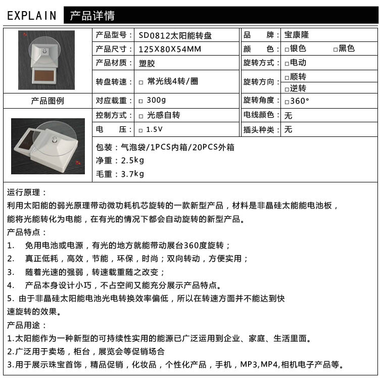 - 免用电池或电源,有光的地方就能带动展台360度旋转;