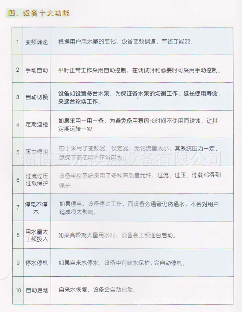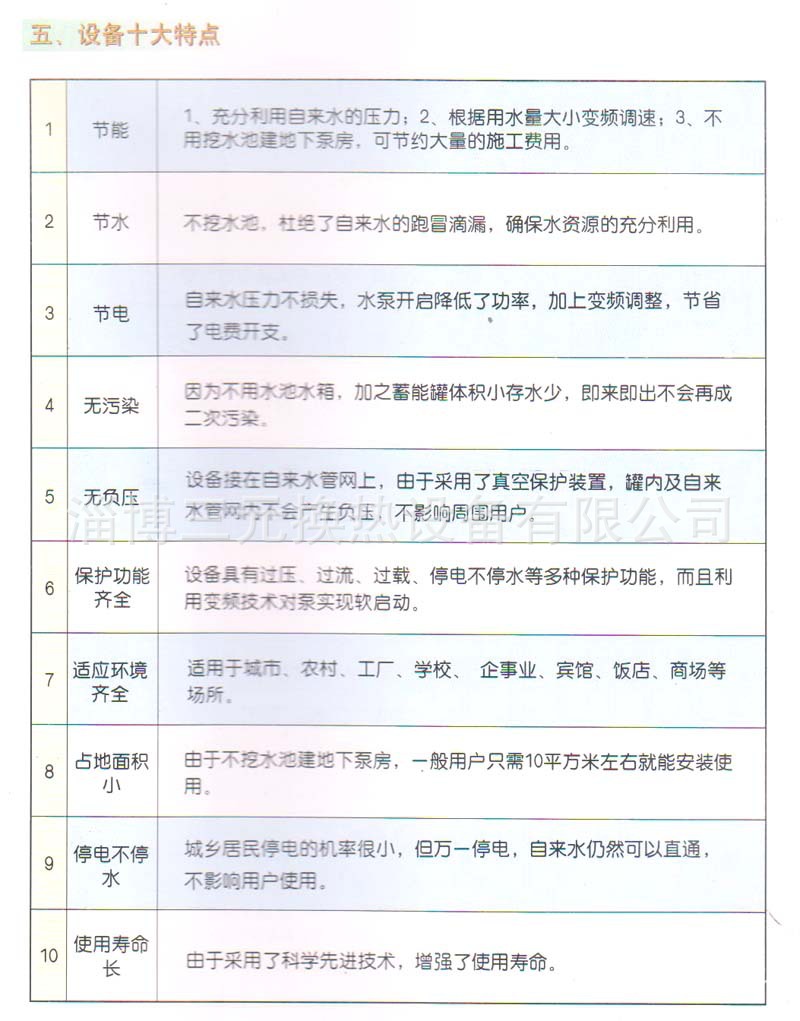 公司主导产品—换热设备和供水设备。换热设各有浮动盘管、复合流程、双纹管、板式换热器四大系列300余个品种;供水设务有XZG系列蓄能增压全自动供水设各;FPS系列变频恒压给水、补水设备;NG (P)系列囊式自动给水设备、定压补水设备:无负压供水设备:蓄水设备有组合式不锈钢焊接水箱等系列500余个品种。另外还生产与空调、暖通系统配套的分、集水器、除污器、过滤器、软水箱等其它设备口管壳式换热器,曾先后荣获国家发明奖、山东省科技进步·等奖;列管式换热器曾荣获山东省科技进步二等奖;并先后被国家建设部评定为“工程建设推荐产品;被化工部评定为“化工工程建设定点产品”;被山东省质量协会确认为“向社会推荐产品”。并在通过IS09001国际质量体系认证。公司历年来多次被山东省政府评为“重合同.守信用”企业;“科技先导型”企业。