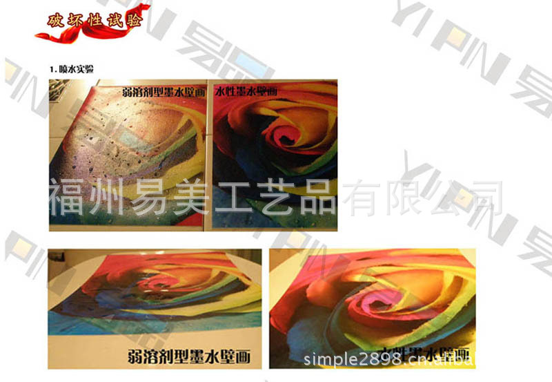 这是我们最值得骄傲的地方,泡水实验三天过后弱溶剂壁画几乎没有任何色彩上的变化,在防潮防水防紫外线的实验中弱溶剂产品均可以通过考核。