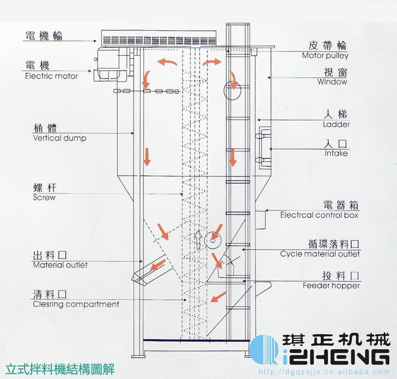 大型立式搅拌机采用螺旋搅拌工作原理(如下图),将投入料斗中的物料通过螺旋叶主轴送到桶体上端,再以抛撒的方式将物料抛撒落下,一直持续循环,从而达到混合均匀的效果,该系列机型适用于塑胶染色造粒,改性,再生破碎料回收加工等行业,主要用于颗粒状物料搅拌混合,干燥,储存等用途。本系列方式搅拌机分为干燥式和无干燥式。