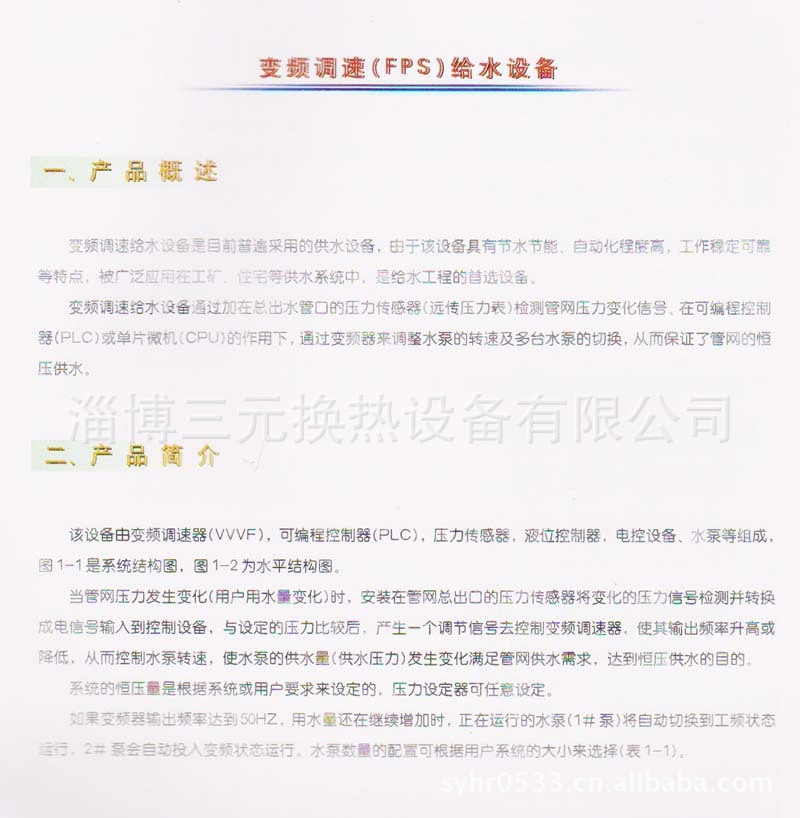 公司主导产品—换热设备和供水设备。换热设各有浮动盘管、复合流程、双纹管、板式换热器四大系列300余个品种;供水设务有XZG系列蓄能增压全自动供水设各;FPS系列变频恒压给水、补水设备;NG (P)系列囊式自动给水设备、定压补水设备:无负压供水设备:蓄水设备有组合式不锈钢焊接水箱等系列500余个品种。另外还生产与空调、暖通系统配套的分、集水器、除污器、过滤器、软水箱等其它设备口管壳式换热器,曾先后荣获国家发明奖、山东省科技进步·等奖;列管式换热器曾荣获山东省科技进步二等奖;并先后被国家建设部评定为“工程建设推荐产品;被化工部评定为“化工工程建设定点产品”;被山东省质量协会确认为“向社会推荐产品”。并在通过IS09001国际质量体系认证。公司历年来多次被山东省政府评为“重合同.守信用”企业;“科技先导型”企业。
