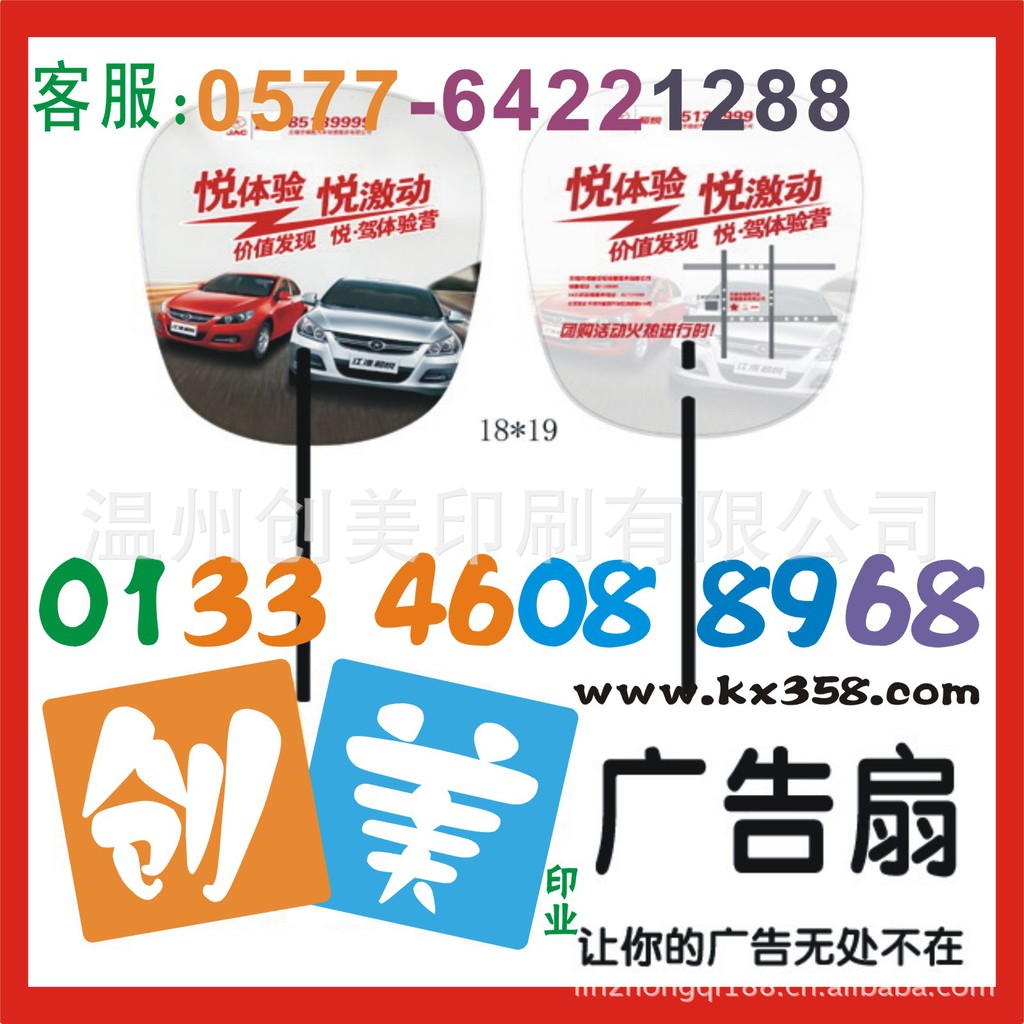 材质: PP广告扇塑料乳白 厚度 60丝 规格: 报价单规格以正常计算,如规格不一样与 我们联系核实价格手柄外形: 按客户要求定做 手柄颜色: 手柄通用颜色:蓝、红、黄、绿、黑、白 扇面外形 方形.圆形.半形.椭圆.异形 印刷: 双面四色印刷 扇面通用规格 17*17cm