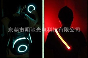 将柔性发光装饰材料缝制在包包外部或包带上,当发光源通电发光时,会让你的包包看起来更炫更酷;在道路上可以引起行人和车辆驾驶人的注意,起到安全提示的作用。对于学生书包来说,这个功能则更为显著)