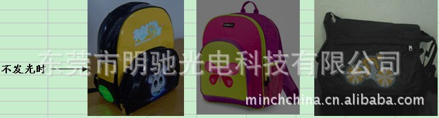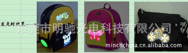 近期,在国外市场上流行一种发光包,常见于发光书包和发光背包这种发光包与普通书包、背包的不同之处在于,在发光包的正面、侧面、内部或者包带部位缝制了一种新型的柔性发光装饰材料,这个光源在通电时会发光并呈现出炫丽多彩的光效,不但能让自己的包包看起来更炫更酷,而且还可以起到比较实用的功能:1、在道路上可以引起行人和车辆驾驶人的注意,特别是夜晚有车流的地方,可以起到安全提示的作用,对于学生书包来说,这个功能更为显著;2、缝制在手提包或公文包的内部,当周围光线较暗的时候,这种光源可以起到照明的作用,打开包后光源会自动亮起,你在找包内物品时将变得更为容易,不再是黑灯瞎火、乱翻一通。这种新型的柔性发光装饰及照明材料将会越来越多的应用到书包,背包,手提包、公文包等产品上面。
