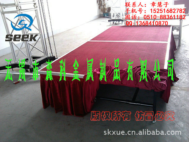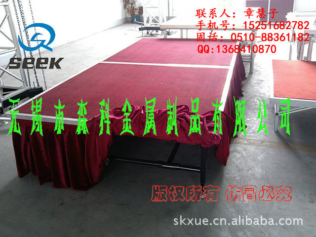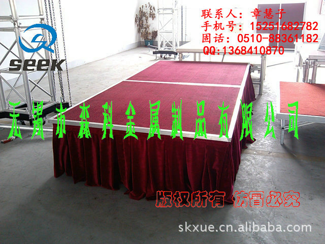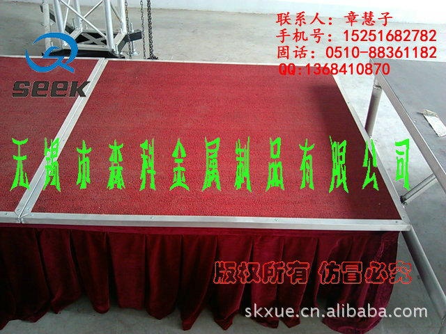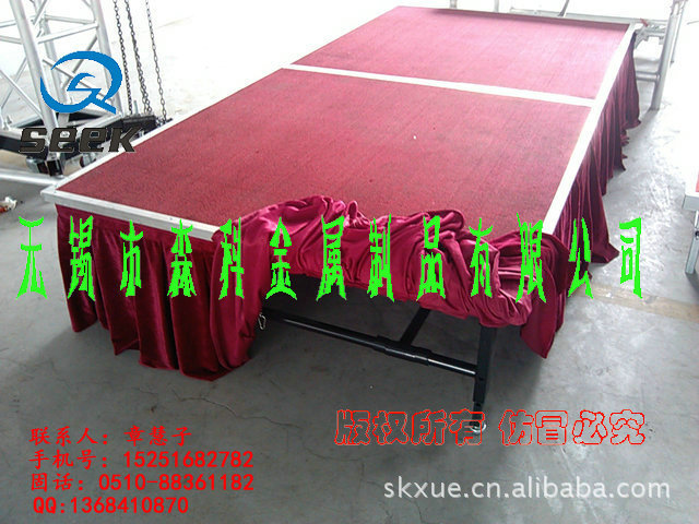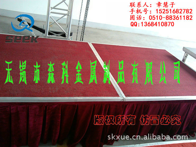无锡森科金属制品公司是一家专业设计,生产和销售为一体的舞台设备公司。包括各种规格型号的钢铁舞台(国家专利斜拉式钢铁舞台、雷亚架钢铁舞台、卡扣式钢铁舞台,折叠钢铁舞台)、拉网舞台,铝合金舞台、玻璃舞台、钢铁桁架(舞台背景架,广告架、喷绘架、展示架)、铝合金桁架、TRUSS架(铝合金灯架、舞台灯光架、舞台支架、展览架)等,高度及尺寸可根据客户要求订做。亦承接工程安装、会展特装、车展、室内外展棚搭建等。公司自成立以来,以优质的产品,诚信合作的理念,服务于海内外客户朋友,产品远销美洲、欧洲、非洲、中东等地区及台湾,香港地区。