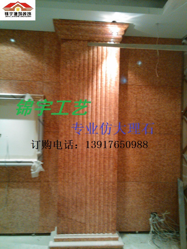 仿大理石GRC构件是最新研制的新型建筑装饰材料。其表面纹理经过特殊处理后,仿真度达95%以上。是现代酒店、娱乐、餐饮等室内装饰必选的高性价比材料。仿大理石GRC构件(彩色GRC构件)与大理石相比具有以下优点:1、 性价比高,价格远低于天然大理石。大幅降低材料成本。2、 可塑性强,艺术质感好,立体造型丰富,设计师可根据项目任意设计造型。3、 安装方便,可预设预埋件,节约安装成本,有效缩短工期4、 环保、无污染,无任何放射性物质,5、 强度高、质地紧密、稳定,安全系数高。6、 自重轻,只有石材重量的2/3,能有效降低墙体载荷。7、 抗冻融、耐酸碱、耐高温,能适应任何恶劣环境。
