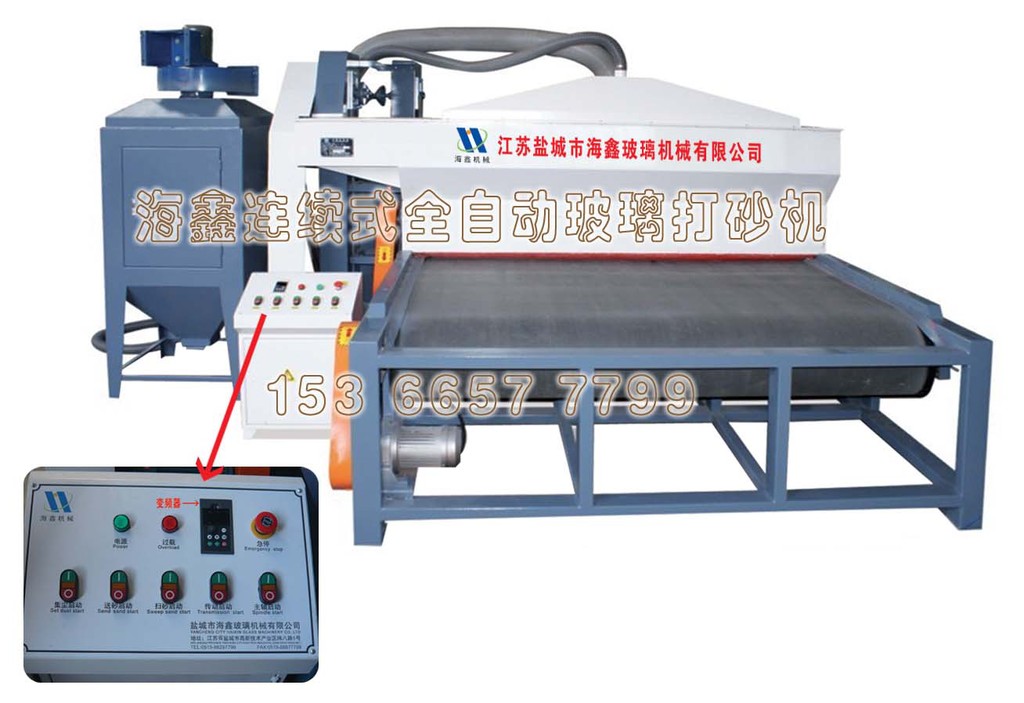 江苏海鑫集团-玻璃机械研究所——最新自主研发国内首台节能高效数控玻璃喷砂机·打砂机·玻璃抛砂机,海鑫玻璃喷砂机特点·低音·高效·节能·环保·省电。该机器自动调节离心轴平衡,高配减震系统,免调节动平衡,不需要人工调节离心轴平衡。革命性突破了喷砂机一直以来的调节平衡的困境,更换刀片省心方便,机器运行声音低更加稳定,省电节能;永远没有振动感!!!上下砂系统全部实现自动化,喷砂,打砂及关闭供砂系统实行电子自动化定时控制,玻璃喷砂,打砂无需人工监控。使喷砂员工工作环境轻松愉快!!!喷砂系统科学合理;喷砂耗材只有老款喷砂机二分之一,无需更换喷砂机前后喷砂护板;使得贵公司生产经营成本会大大降低;更具有市场竞争力。欢迎新老客户来我公司实地考察。