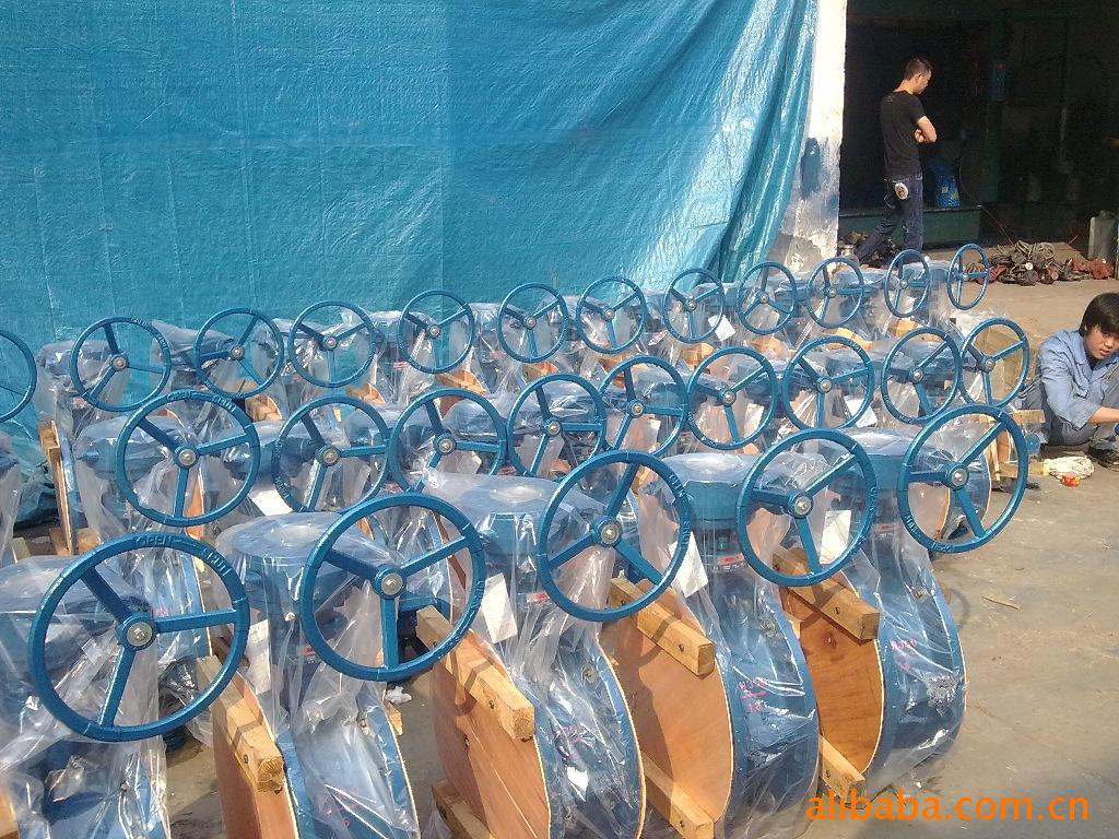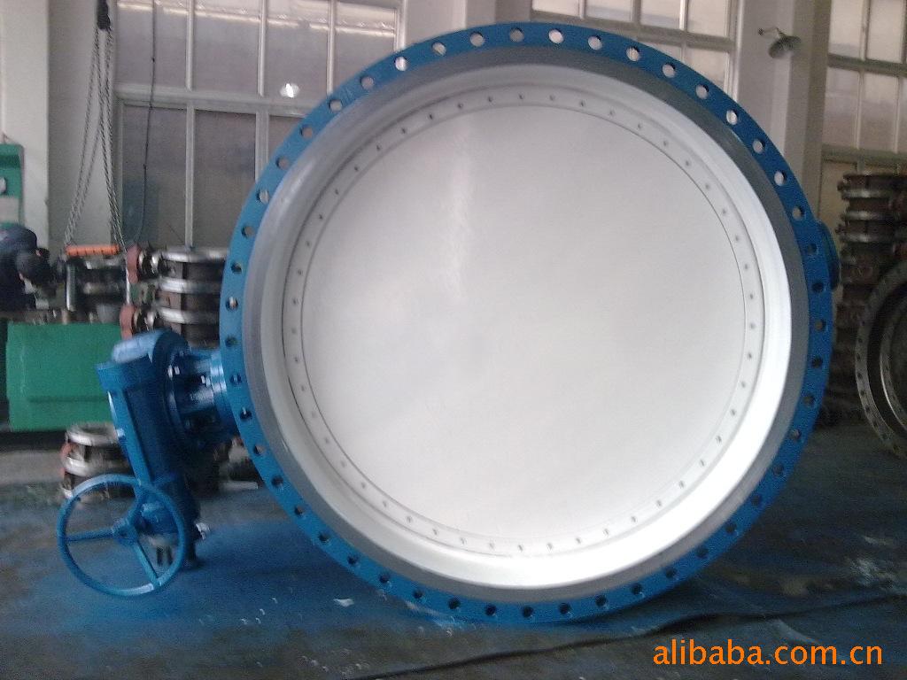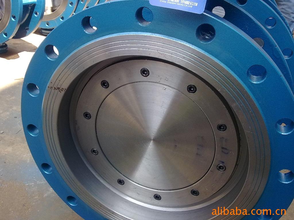 高性能三偏心双向硬密封蝶阀,其特征在于:所述阀座密封圈由软性T形密封环两侧多层不锈钢片组成。阀板与阀座的密封面为斜圆锥结构,在阀板斜圆锥表面堆焊耐温、耐蚀合金材料;固定在调节环压板之间的弹簧与压板上调节螺栓装配一起的结构。 这种结构有效地补偿了轴套与阀体之间的公差带及阀杆在介质压力下的弹性变形,解决了阀门在双向互换的介质输送过程中存在的密封问题。采用软性T型两侧多层不锈钢片组成密封圈,具有金属硬密封和软密封的双重优点,无论在低温和高温情况下,均具有零渗漏的密封性能。 试验证明池正流状态(介质流动方向与蝶板转动方向相同)时,密封面的压力是传动装置的力矩和介质压力对阀板的作用产生的。正向介质压力增大时阀板斜圆锥表面与阀座密封面挤压越紧,密封效果越好。当逆流状态时,阀板与阀座之间的密封靠驱动装置的力矩使阀板压向阀座。随着反向介质压力的增大,阀板与阀座之间的单位正压力小于介质压强时,调节环的弹簧在受载后所储存的变形能补偿阀板与阀座密封面的紧压力起到自动补偿作用。因此本实用新型不像现有的技术那样,在阀板上安装软硬多层密封圈,而是直接安装在阀体上,在压板和阀座中间增设调节环是十分理想的双向硬密封方式。它将可取代闸阀、截止阀及球形阀。