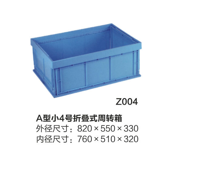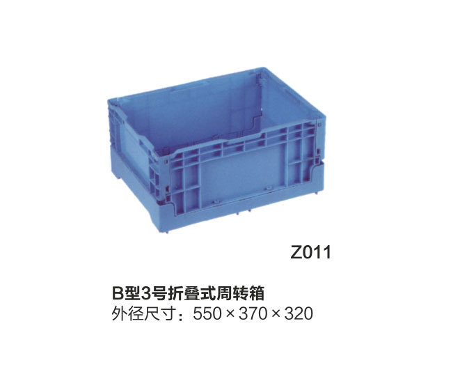 折叠周转箱采用国际流行款式,根据折叠方式的不同,有对折式和内倒式两种折叠方法,折叠后的体积只有组立时体积的1/4-1/3,具有重量轻、占地少、组合方便等优点。已在各大连锁超市、24小时便利店、大型配送中心、百货商场、轻工、服装、家电、食品加工等闭环回路配送系统中广泛使用。