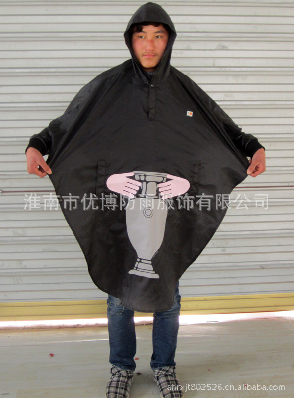 该款式为2012年欧洲足球赛专用雨衣,使用高档防雨面料,内层为AC胶涂层,前片带口袋,前后印制欧洲杯LOGO标志,不变形不褪色,是理想的户外休闲雨衣。