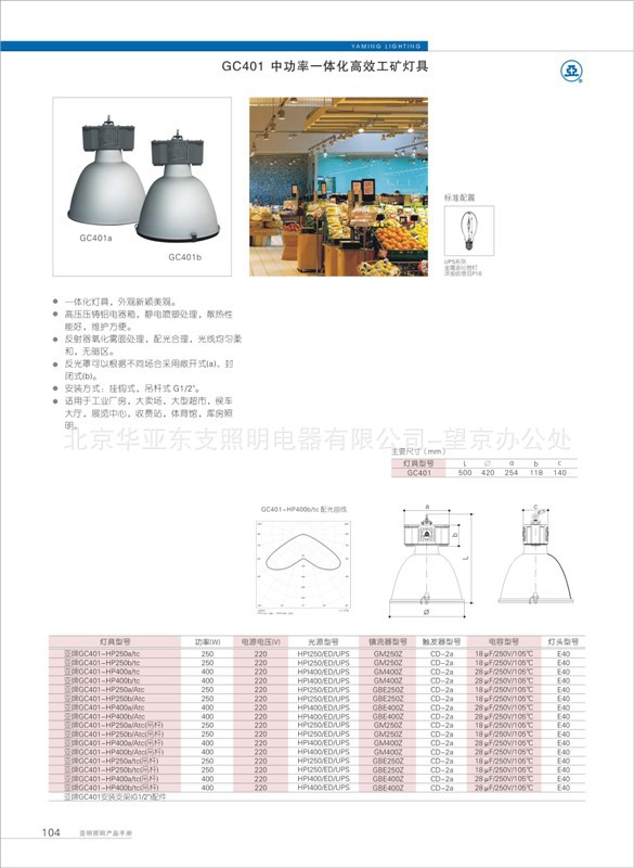 GC401中功率一体化高效工矿灯具,适用于工业厂房、大卖场、超市、车库等 。