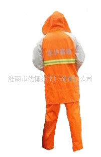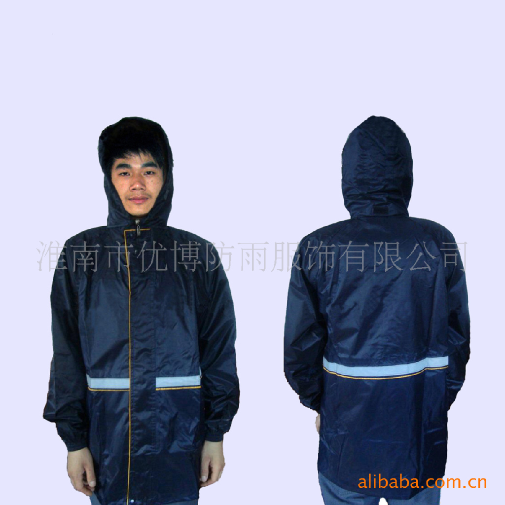 该款式为抗静电雨衣套装面料,加涂100%防水PVC涂层,高强度反光条,暗藏式帽子,上下身分体套装,防盗防水口袋,休闲款式!是理想的安全的野外作业防护雨衣。