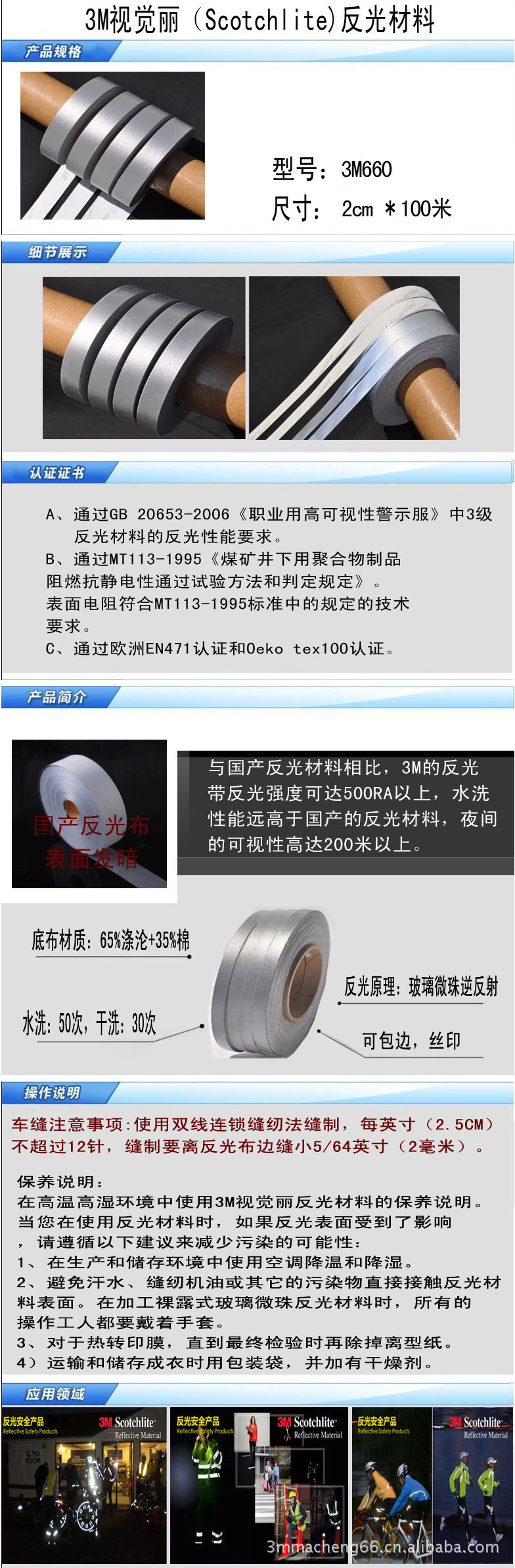 无锡市马成服装辅料有限公司是3M公司正规授权的经销商,所经销(批发)的3M反光材料、3M反光布、3M反光带、3M反光条、3M反光热贴膜等反光产品,畅销消费者市场,在消费者当中享有较高的地位,是品牌产品企业的首选和用品,公司与国内外知名品牌企业、零售商、3M经销商(3M代理商)建立了长期合作的稳定关系。 无锡市马成服装辅料有限公司经营的视觉丽反光材料(Scotchlite反光材料),以多品种经营特色和薄利多销的原则,以“用人品做产品,诚信是最低标准”的公司理念,赢得了知名品牌公司和广大消费者的信赖和支持。 正品防伪查询: 进入3M官网点击相关连接中的3M合作伙伴授权证书查询 输入授权证书的证书编号(dnjH4X2012EP021)可以查到本公司的授权资料。 (授权证书每年会更新,由于业务繁忙客服来不及更新,需要最新版本授权证书,请与客服联系或致电0510-83707490)