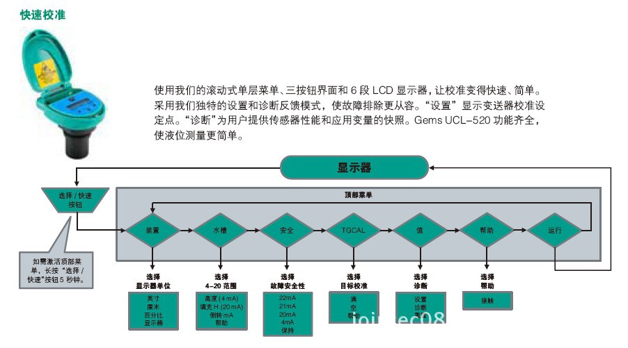 设置方便、快捷。组合按钮校准和LCD显示器