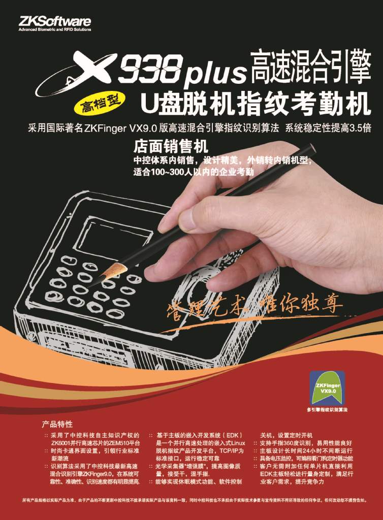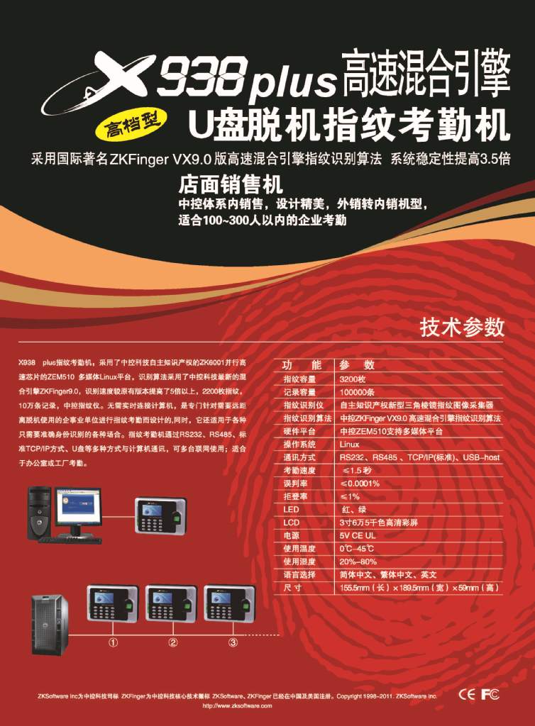 X938plus指纹考勤机,采用了中控科技自主知识产权的ZK6001并行高速芯片的ZEM510 多媒体Linux平台,识别算法采用了中控科技最新的混合引擎Biokey8.0,识别速度较原有版本提高了5倍以上,3200枚指纹,80000条记录。无需实时连接计算机,是专门针对需要远距离脱机使用的企事业单位进行指纹考勤而设计的。同时,它还适用于各种只需要准确身份识别的各种场合。指纹考勤机通过RS232、RS485、标准TCP/IP方式、U盘等多种方式与计算机通讯,可多台联网使用,适合于办公室或工厂考勤。