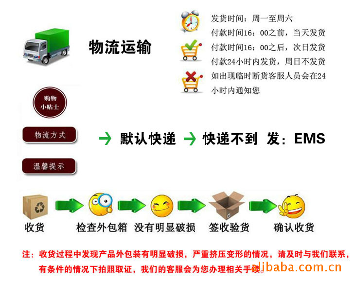 【申明】发货前都会有专人进行严格检查,尽量确保无质量问题,但谁也无法做到百分百,肉眼不是机器;收到货后出了问题,也请配合我们在第一时间拍下照片,请及时联系我们,并把订单号报给我们,我们会给予及时处理。